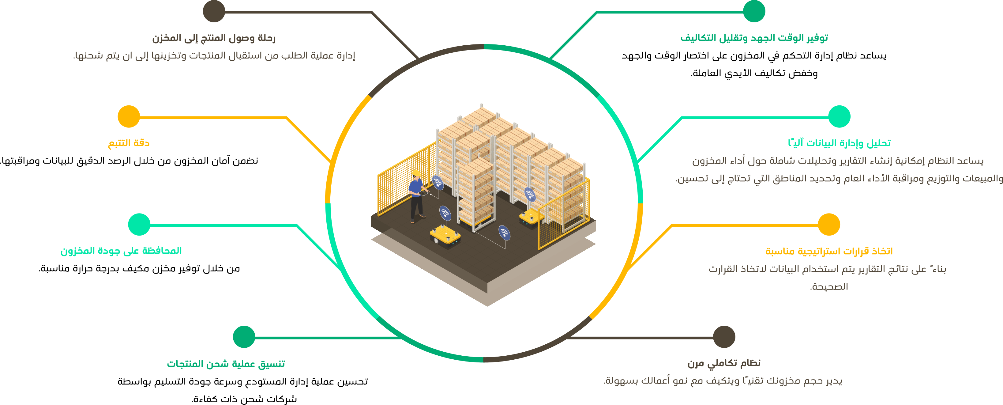 يوفر النظام كافة المعلومات المتعلقة بالمواد والمنتجات المطلوبة للشحن، ومكان وجودها في المخزن، إضافة إلى حساب كميات المنتجات والمواد بدقّة مما يسهّل عملية تحضير الطلبات وزيادة المبيعات.